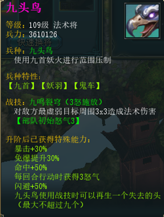 技能再生: 每次施放主动技能,九头鸟都会重新长出 1枚 妖首(上限9枚)。